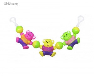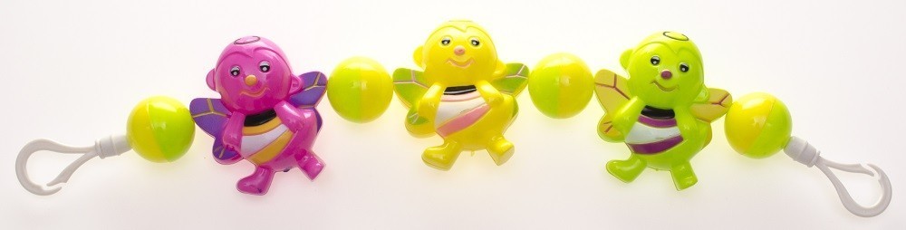 A rugalmas zsinórra felfűzött kedves figurák szórakoztatják a gyermeket. Babakocsira vagy kiságyra rögzíthető.