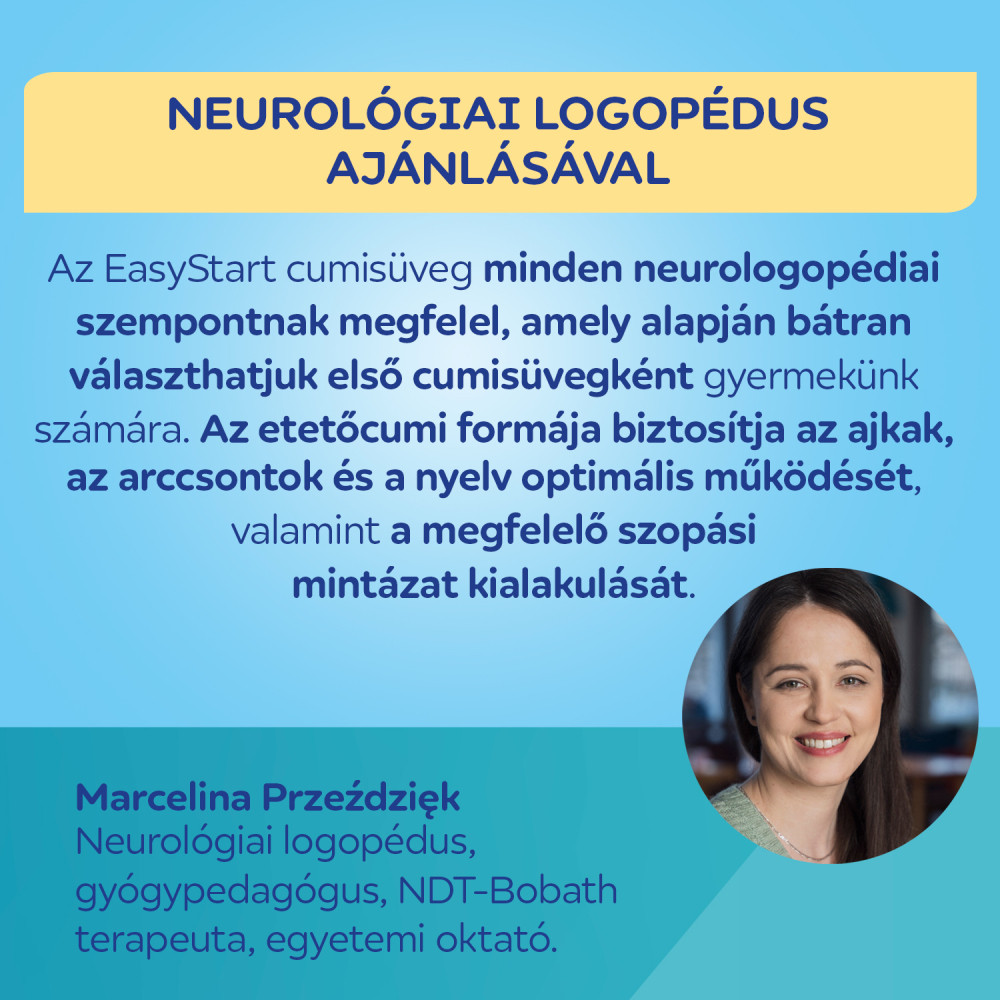 "Az EasyStart cumisüveg megfelel minden logopédiai kritériumnak, amely alapján jó választás lehet a baba első cumisüvegének."Marcelina Przeździęk - logopédus, gyógypedagógus, NDT-Bobath terapeuta, egyetemi oktató.