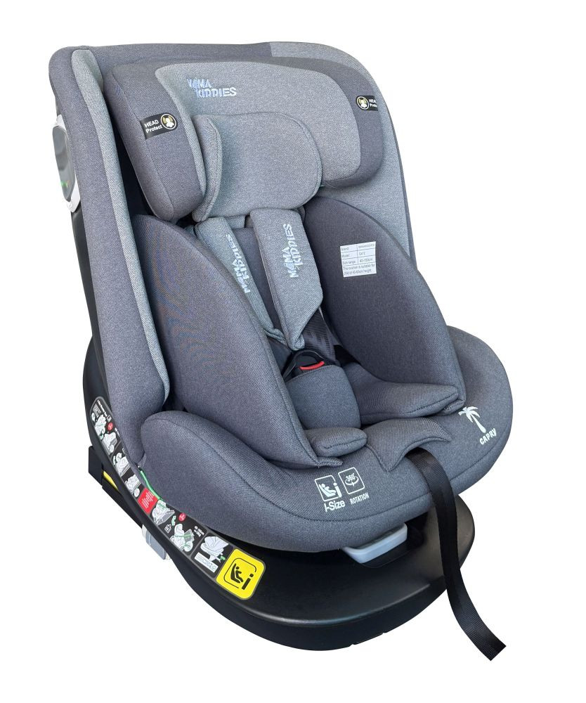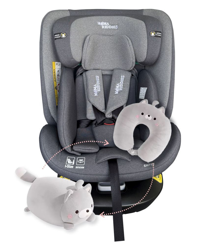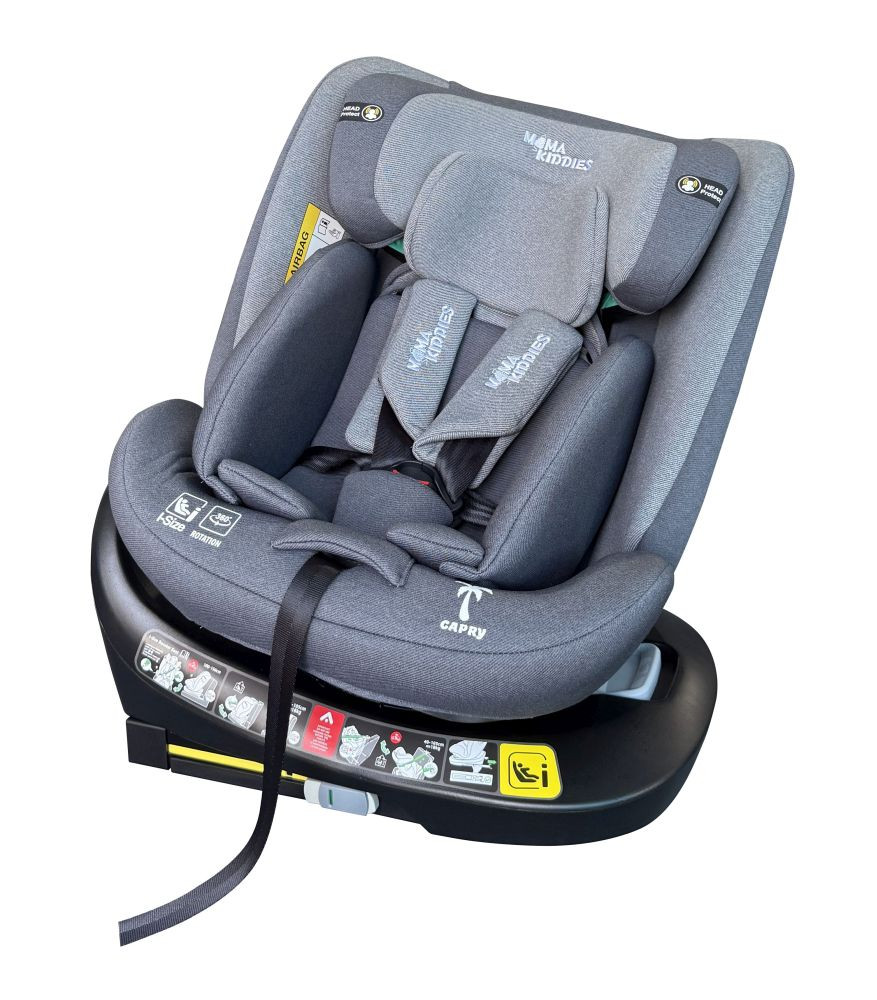 Biztonságos és kényelmes utazást biztosít. A gyerekülés elforgatható 360 fokban, valamint állítható háttámlával és fejtámlával rendelkezik. A Mama Kiddies elkötelezett a gyermekek biztonsága és kényelme mellett, ezzel az üléssel új mércét határoz meg a gyermekbiztonság terén.