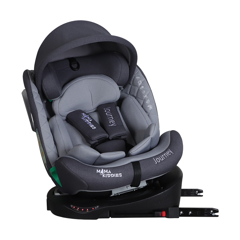 ISOFIX-es 360°- ban forgatható Mama Kiddies iSize Journey Extra biztonsági autósülés (40–150 cm) szürke színben támasztólábbal ajándék napvédővel és lábtartóval
